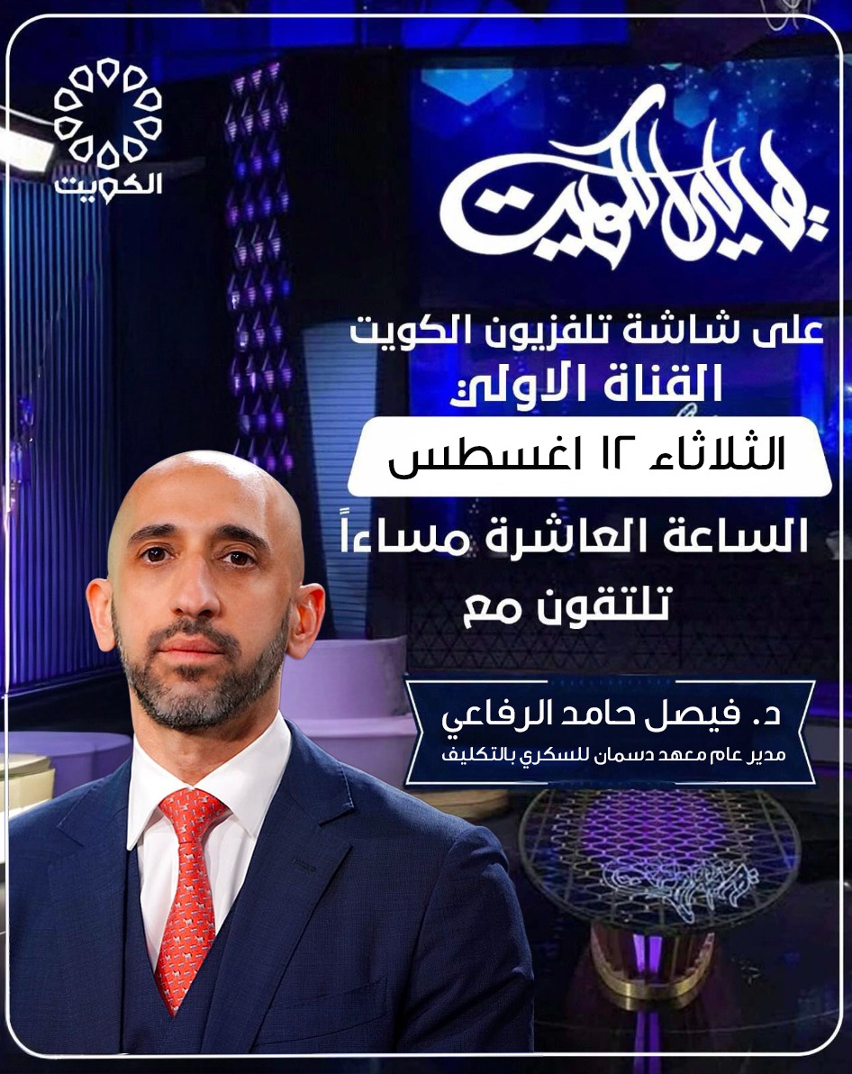 ترقبونا الليلة على شاشة تلفزيون الكويت – القناة الأولى الساعة 10 مساءً مع د. فيصل حامد الرفاعي – مدير عام معهد دسمان للسكري بالتكليف