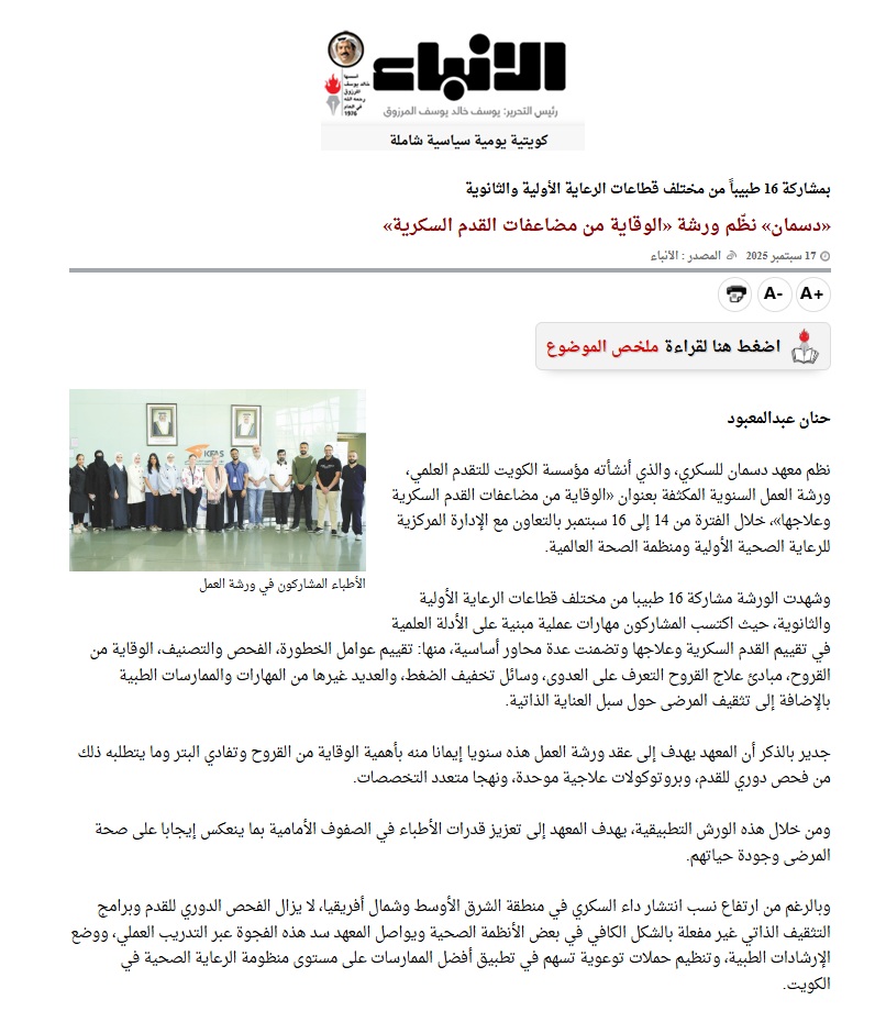 رسالة المعهد مكافحة مرض السكري في الكويت من خلال أبحاث مرض السكري المتقدمة والوقاية المتكاملة والتدريب والتعليم.