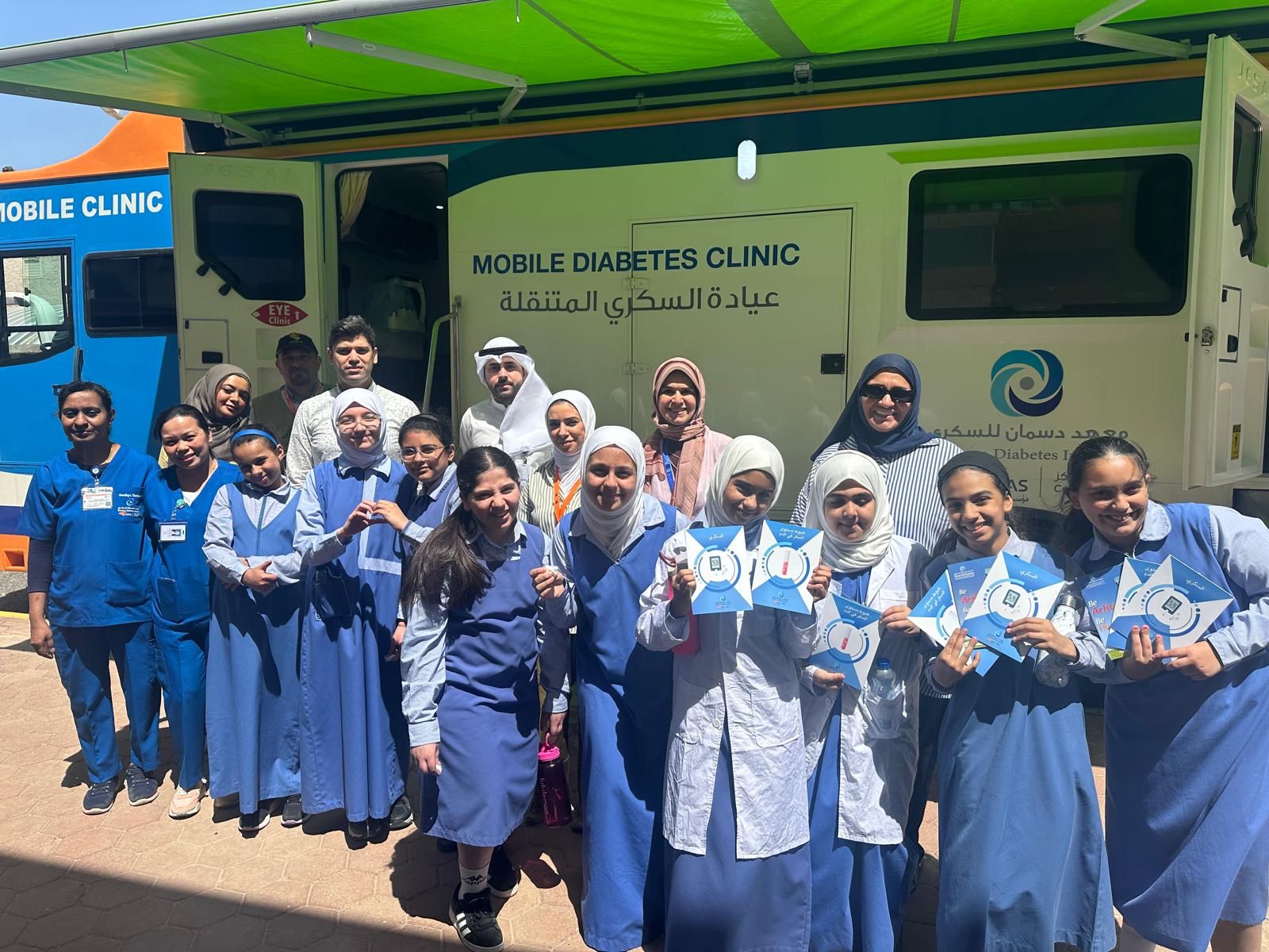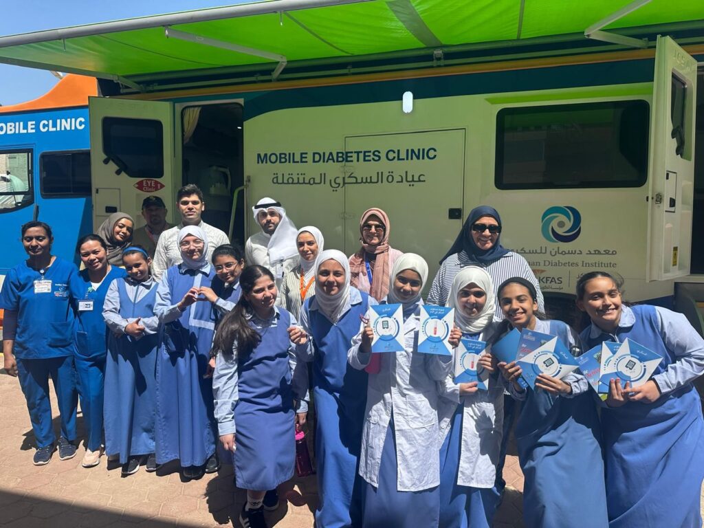 DDI’s Diabetes Mobile Clinic, in cooperation with the Science Bus of the Kuwait Foundation for the Advancement of Sciences, visited Fatima Bint Al-Yaman Middle School for Girls in Zahra, where DDI’s team conducted examinations for the students and teachers and provided medical consultations and awareness brochures.