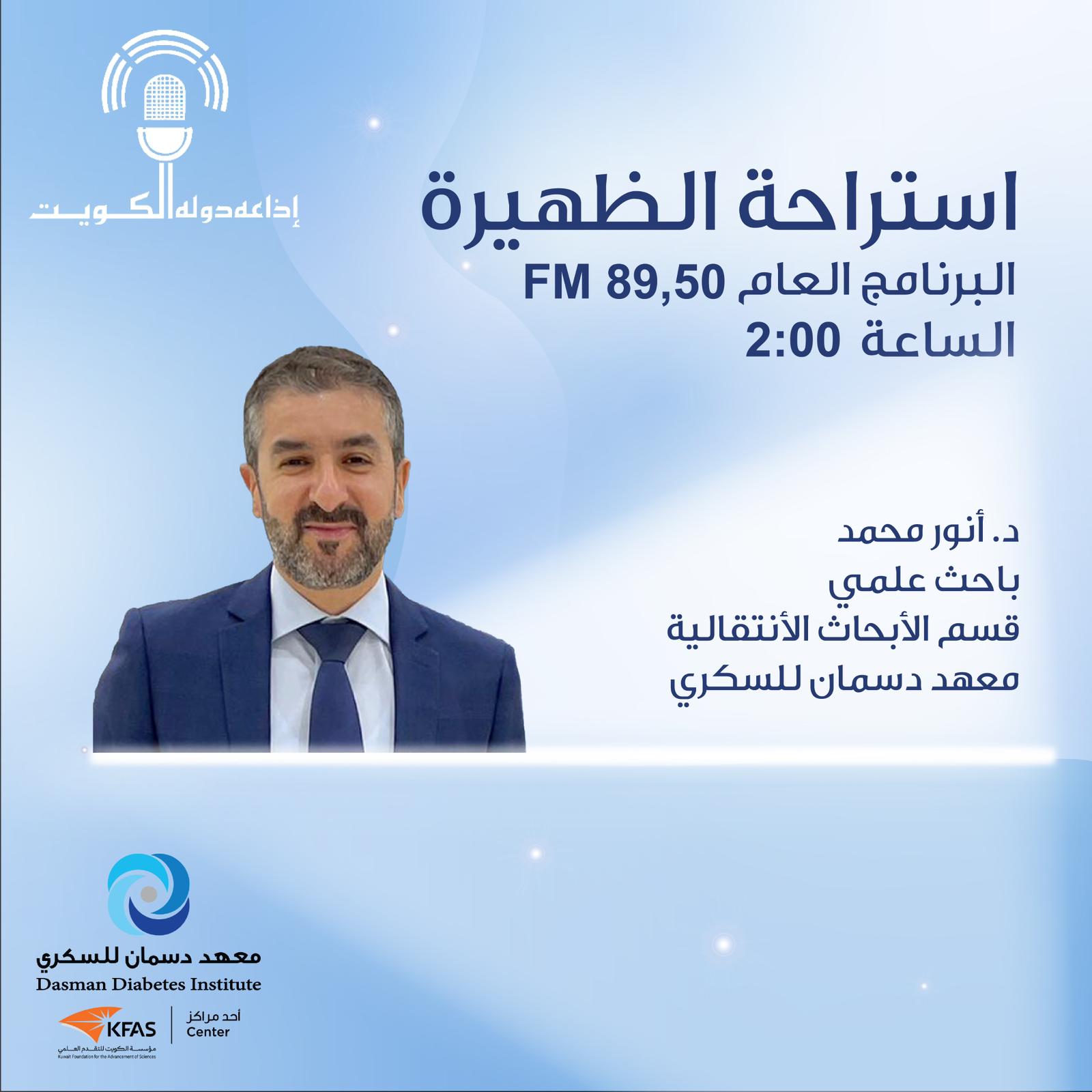 Stay Tuned to 89.5FM for an interview with Dr. Anwar Mohammed, a Senior Scientist in the Transitional Research Department at the Desman Diabetes Institute, for an interesting discussion about his new study conducted using artificial intelligence technologies. Follow the interview.