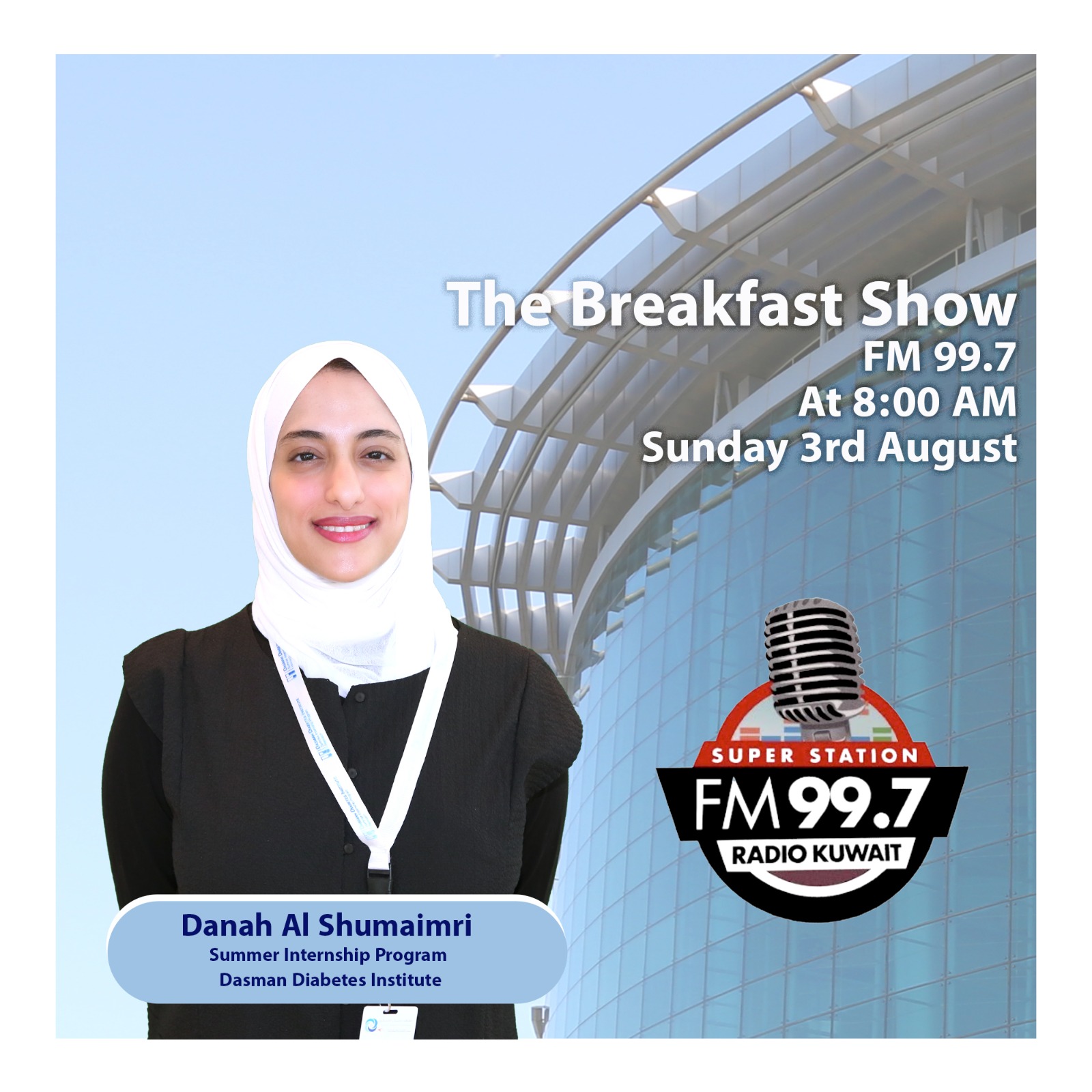 The Breakfast Show on Superstation 99.7 will host Danah Al Shumaimri, summer intern at Dasman Diabetes Institute, on Sunday 8a.m. to share her experience in the Summer Internship Program.